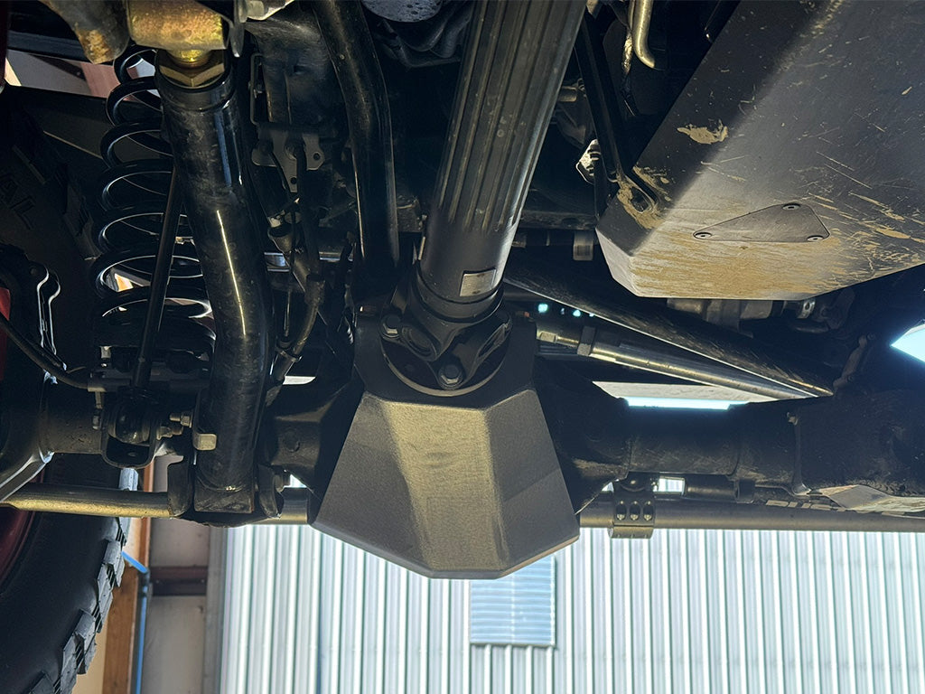 Rusty’s JL Front Diff Skid is built from a combination of 1/4” thick steel, designed to withstand hard hits and distribute impact forces across multiple mounting points. The skid ties into multiple locations on the differential flange while also clamping securely to the differential snout, reinforcing critical components. Additionally, this skid extends protection to the pinion and yoke/flange where the front driveshaft connects, ensuring comprehensive coverage.