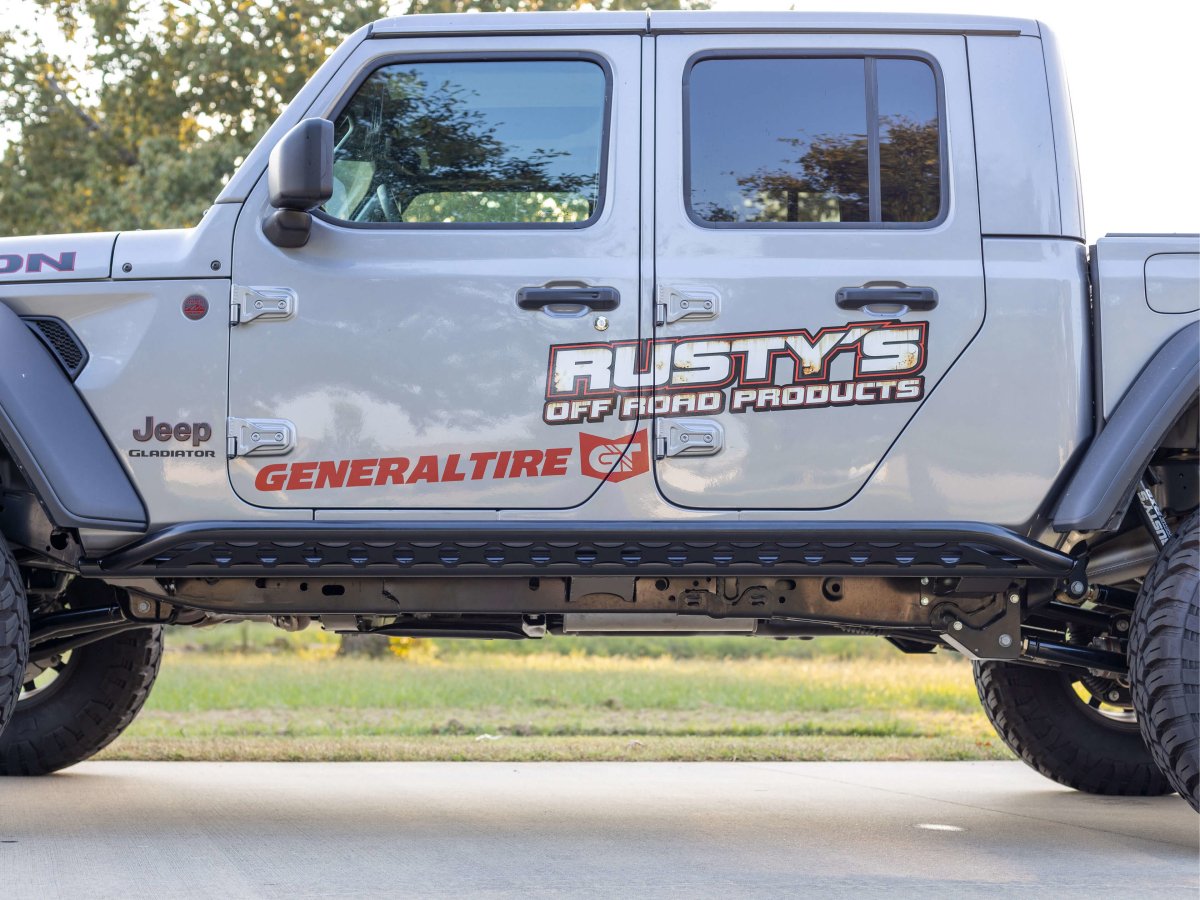 The Rusty's JT Gladiator Rocker Armor with Kicker Tube provides valuable protection from rocks and other obstacles on the trail, The second tube angles up and offers a limited step to help with entry, and are a simple bolt-on installation! we did our home work on designing these rockers to offer simply the best protect for the rockers as well as other parts of your Jeep. Being bolt on and how we secure to the frame there is no chance of doing damage to the frame welding them on, no chances of a fire while installing them and the way they bolt up you will see less flex from these tan a set that has been welded to the frame.