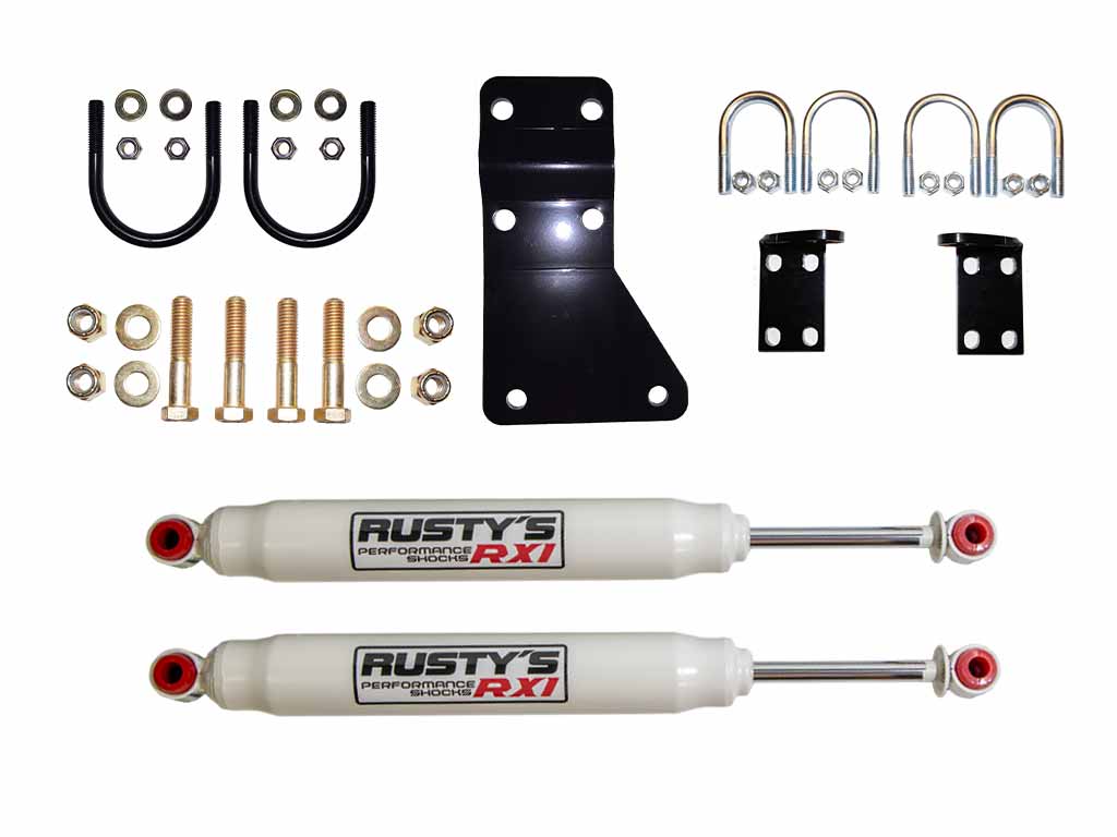 Rusty's Dual Stabilizer Kit locates the cylinders above the tie rod, up and out of the way from damaging trail obstacles. Sold as a complete kit that includes the stabilizers, mounting brackets, and related hardware.