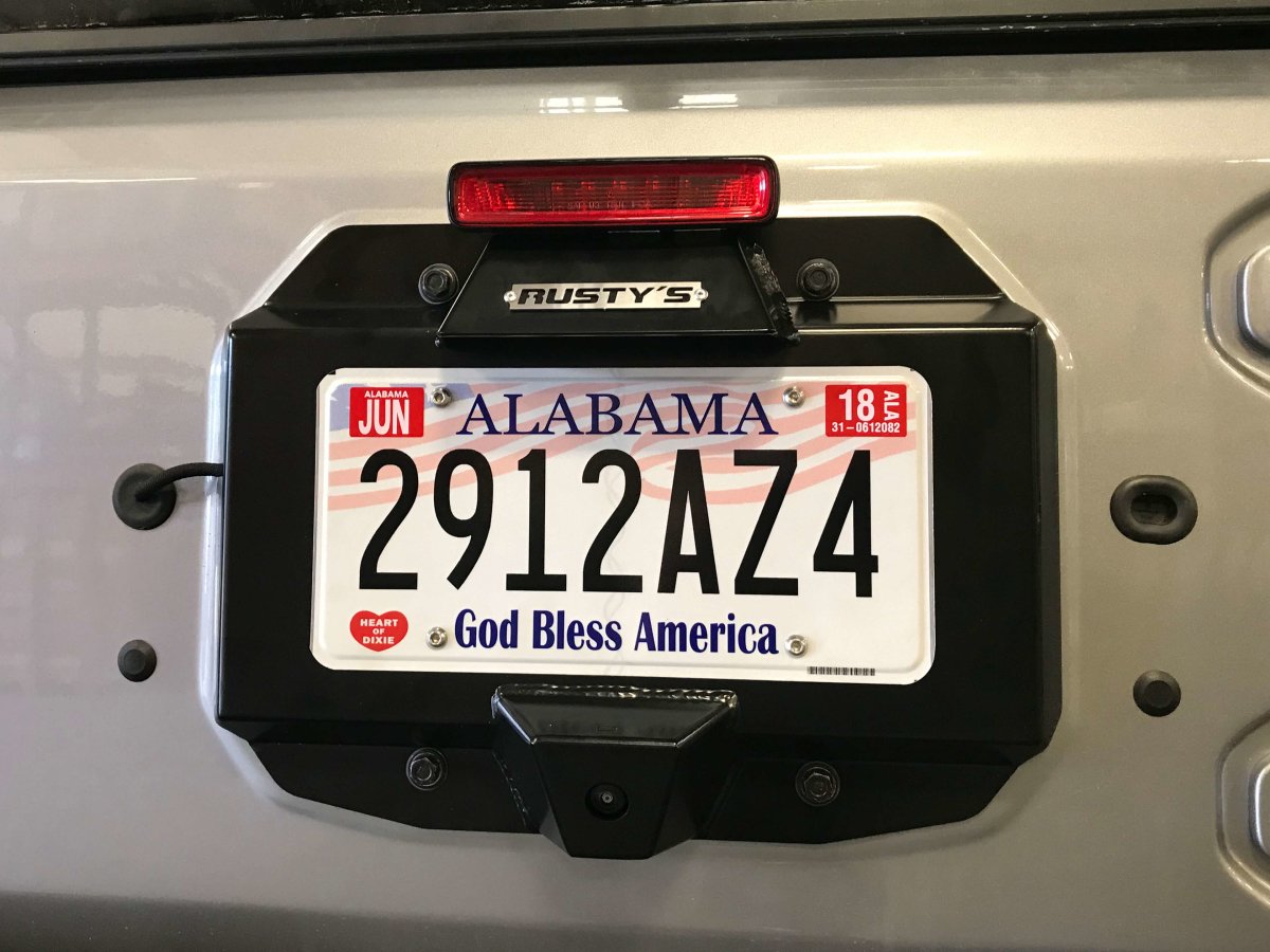 The new Rusty's license plate mount provides a clean and easy way to delete the spare tire mount and relocate the license plate mount all at the same time! The mount incorporates the factory camera and the factory 3rd brake light as well as re-using the factory light to illuminate the license plate. The camera angle remains factory, and since we're re-using the factory 3rd brake light, you won't have to deal with some cheap aftermarket piece like many other mounts. No drilling or trimming is required for installation since the bracket uses existing mounting holes and also covers up several unsightly holes in the tailgate when you remove the factory spare tire mount. The bracket itself is constructed of laser-cut steel and comes in a durable satin black powder coated finish. Like all of our products, the JL License Plate Mount is Made in the USA!