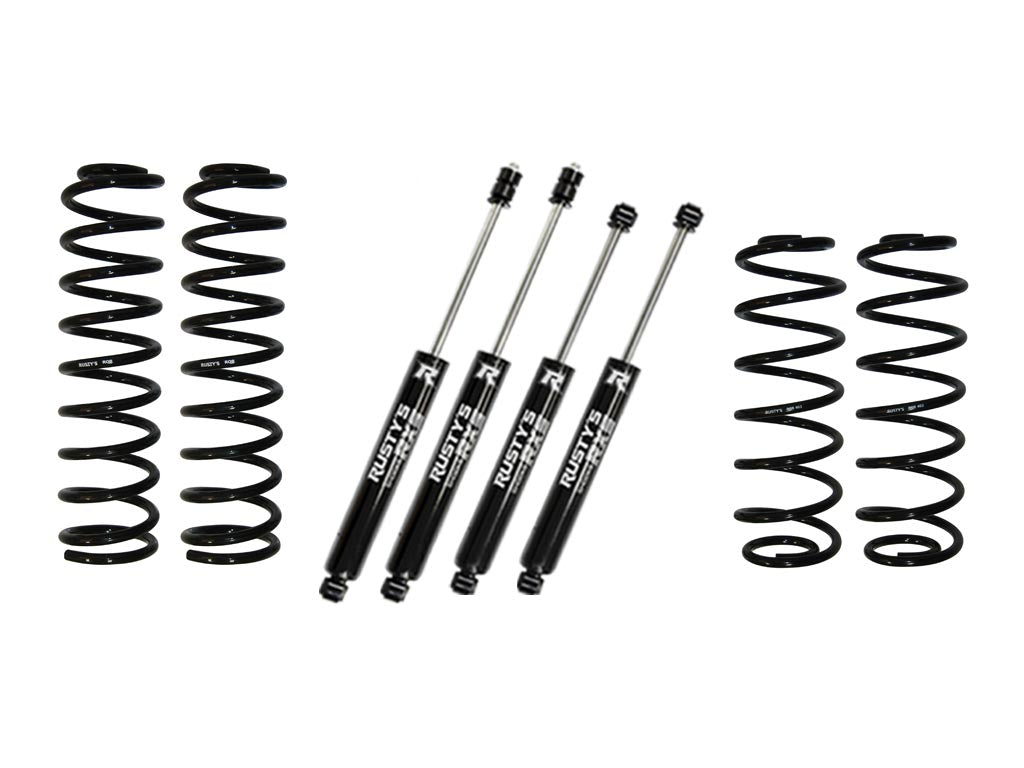 Rusty's 2" Basic kit provides the clearance needed for 32" inch tall tires. Rusty's uses computer modeling to design the coil springs, which retain the factory ride quality while delivering the ground clearance needed to get to that remote hunting spot or fishing hole. The Basic kit is also a good choice for Jeeps with a suspension that has lost height due to wear and fatigue. This kit includes your choice of Rusty's Performance Shocks and is compatible with TJ/LJ Wrangler, Rubicon, and Unlimited models. An easy installation makes the Basic kit perfect for do-it-yourselfers!