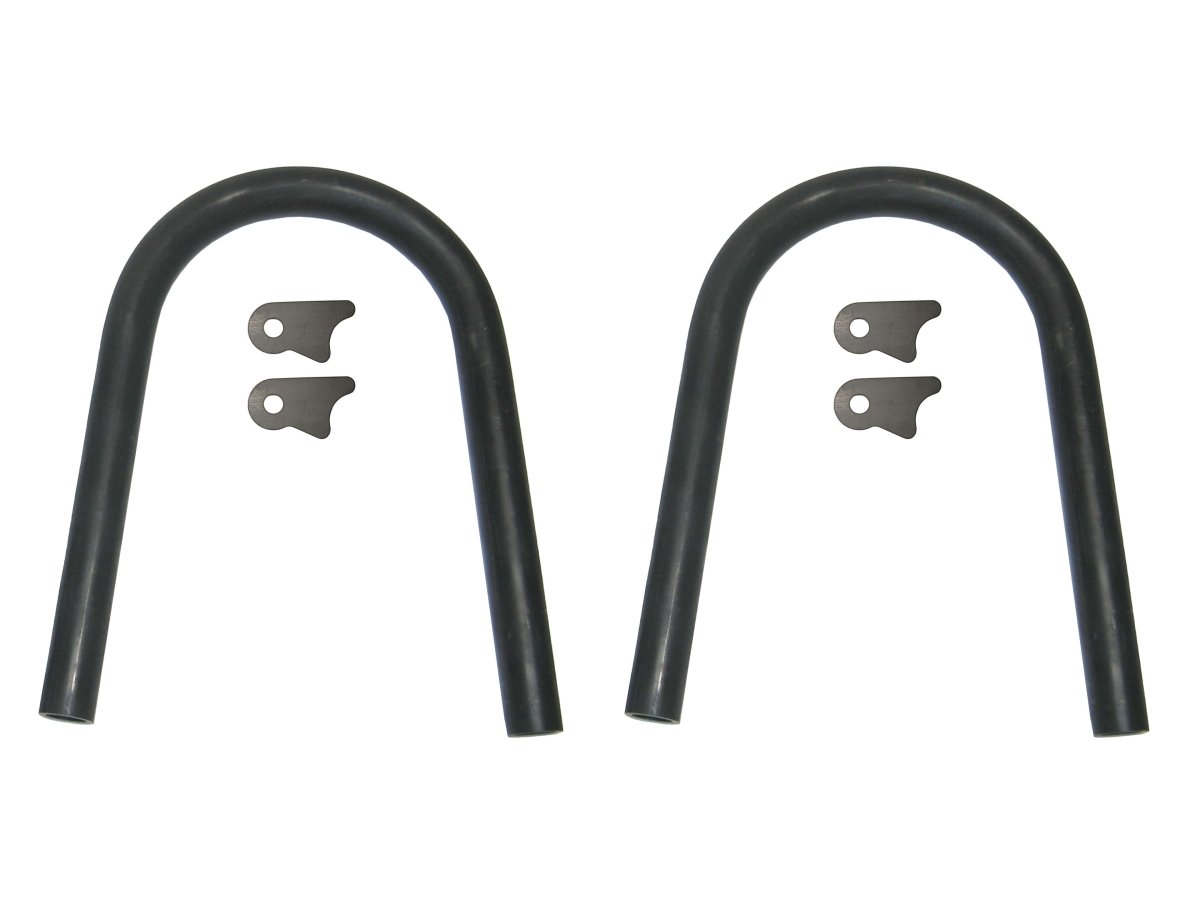 Rusty's Universal shock hoops start with 1-1/2" x 0.125-wall tubing that is CNC formed in a conventional hoop. Four mounting tabs are shipped loose in order to accommodate the spacing of different bushing arrangements. The hoops themselves measure 14" tall but can be easily cut down to fit individual needs. The shock tabs themselves are constructed from 3/16" laser-cut steel. Suitable for front or rear mounting. Sold in pairs.
