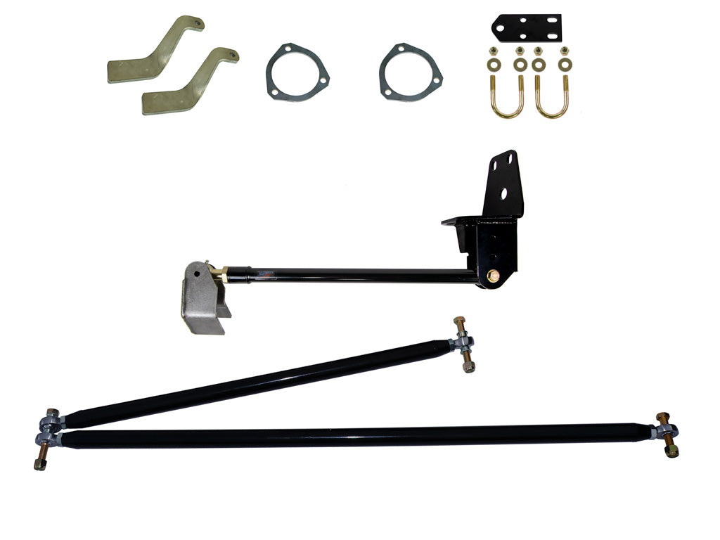 The steering tie rod and drag link consist of 1.25" diameter DOM tubing that utilizes 7/8" heim joints, safety washers, misalignment spacers, and all grade 8 hardware. The system requires a new track bar and track bar mounting points to keep the track bar and drag link moving in the same plane with one another; this eliminates the possibility of bump steer, wandering, and other undesirable steering characteristics. Please note that this system requires cutting and welding for installation. The tie rod, drag link, and track bar are powder-coated black.