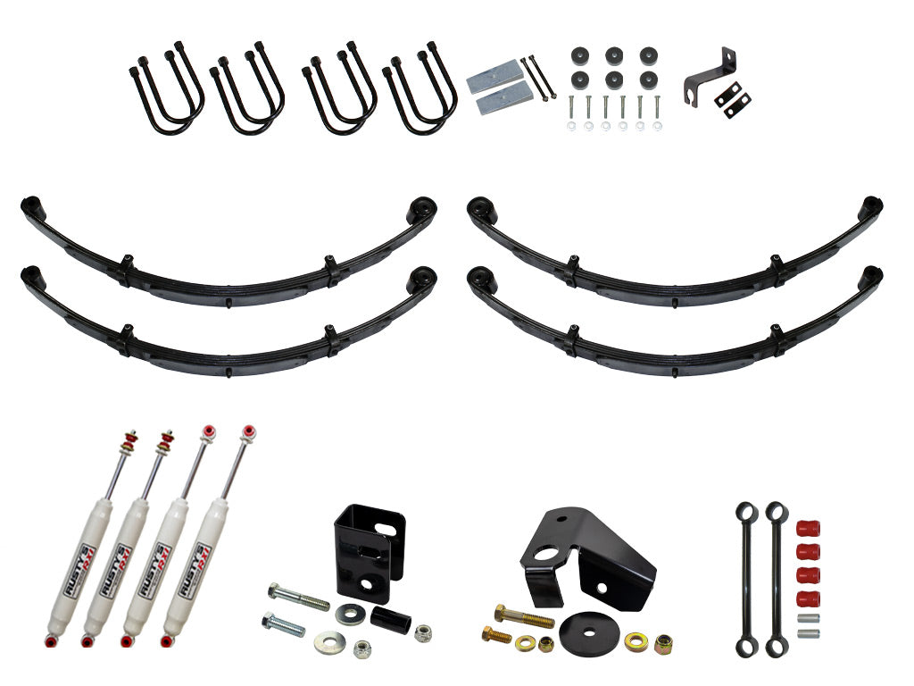 Rusty's 4 inch kit is a great way to get the clearance for 33 inch tall tires without compromising on-road ride quality. Rusty's spring packs are built using 5 individual leafs, both front and rear. The springs feature bolt-style retaining clips and nylon anti-friction pads, both of which allow the individual leafs to slide easily against one another for excellent ride and flexing characteristics. Rusty's springs also feature full military wraps for the extra strength needed when out in the rocks. Rubber bushings are used in the frame-mount end of the spring for better flex and ride quality, while poly bushings are used at the shackle end for stability and superior handling.